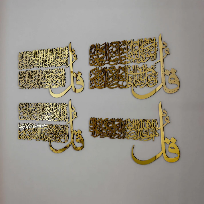 Elevate your home with IWAS Premium Luxury Acrylic 4 Qul Wall Art, featuring beautifully laser-cut Arabic calligraphy. Perfect for luxury Ramadan décor, prayer areas, and meaningful Muslim gifting.