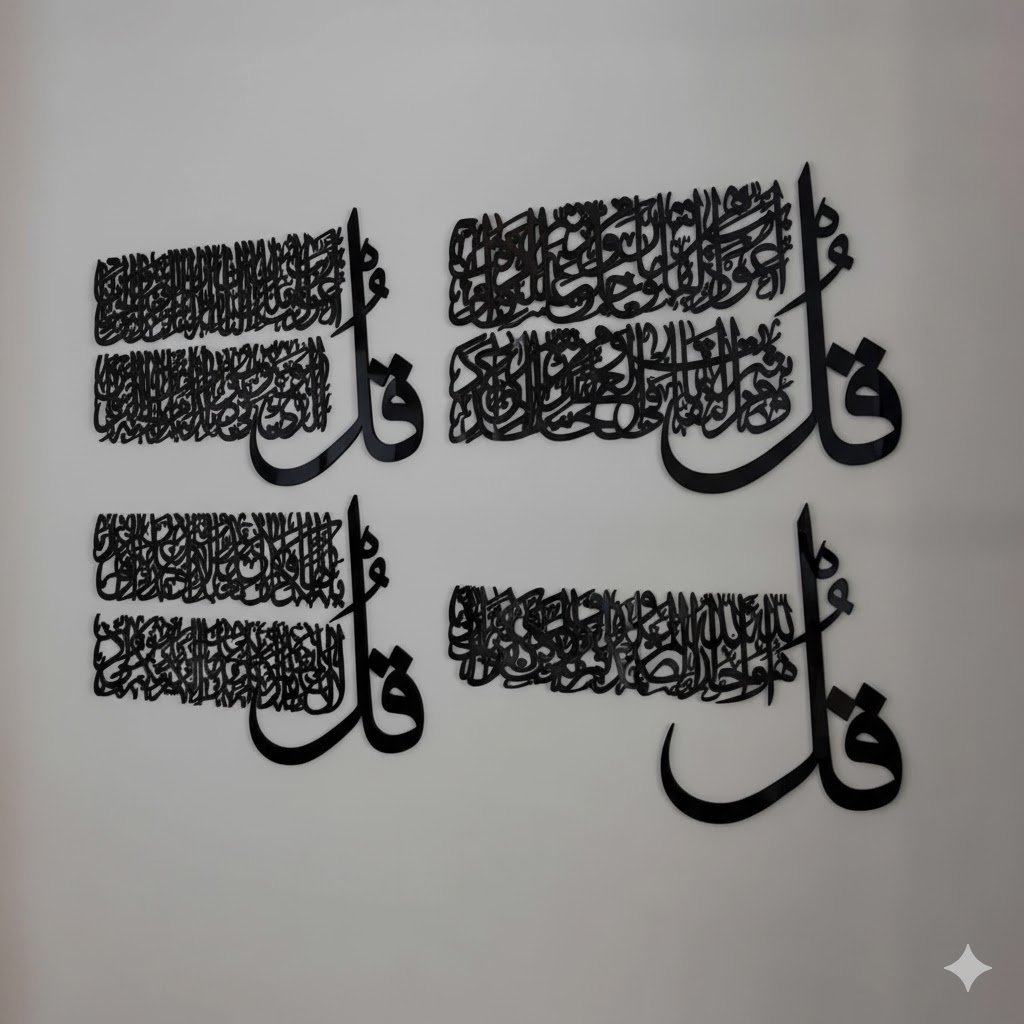 Enhance your home with IWAS Premium Luxury Acrylic 4 Qul Islamic Wall Art, a perfect blend of faith, elegance, and modern luxury. Featuring the sacred 4 Qul Surahs in beautifully laser-cut Arabic calligraphy, this artwork symbolizes protection, guidance, and divine blessings, transforming any wall into a spiritually uplifting statement.